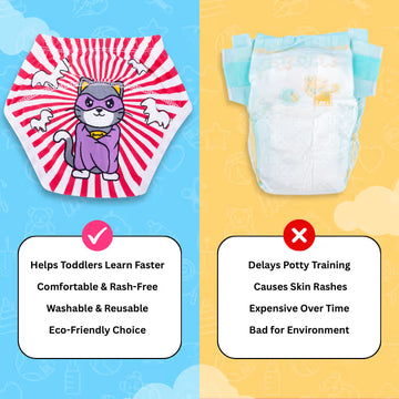 Diapers are used once and thrown away. These pants are washable, reusable, and help kids learn faster. No more endless packs filling your bin or emptying your wallet.